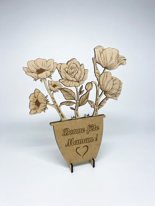 Bouquet de fleurs en bois gravé personnalisé | Cadeau fête des mères, mamie, grand-mère | Message personnalisé | Déco naturelle
