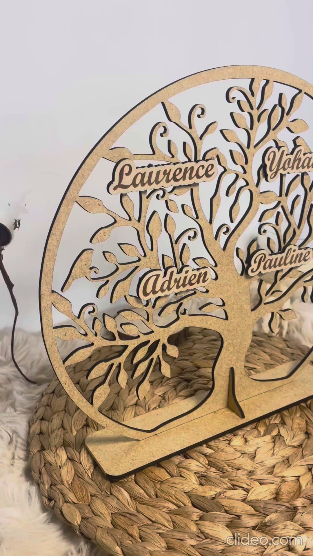 - Matériau : Arbre en bois MDF de 3 mm et prénoms/textes gravés en bois de bouleau de 3 mm 🌳